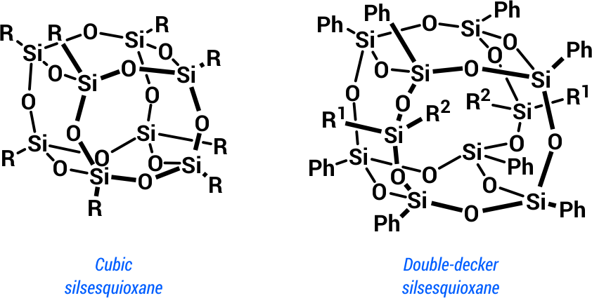 Silsesquioxanes are hybrid compounds that combine features of organic and inorganic systems (Scheme 4). The inorganic fragment is a rigid, chemically robust Si-O-Si core, which is the backbone of the entire structure, while the organic fragments are usually organic substituents (alkyl, aryl, alkenyl groups, etc.) attached directly to silicon atoms located in the core. These substituents may be also reactive groups (e.g., Cl, OH) that allow further direct functionalization.