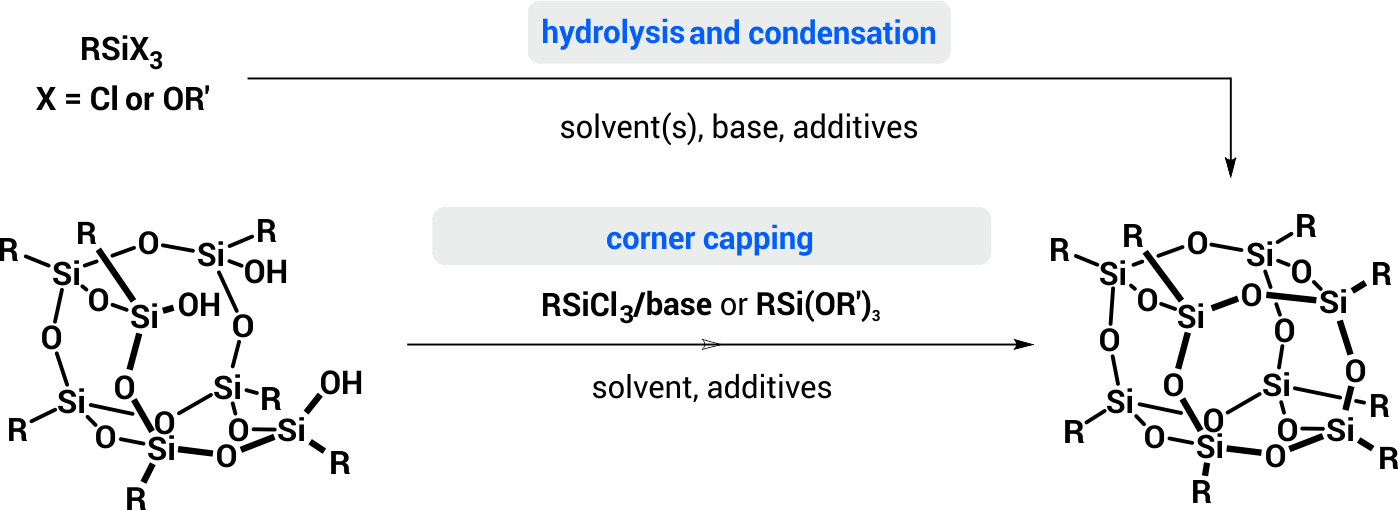 The overwhelming majority of silsesquioxane structures is prepared by condensation of the respective chloro- or alkoxysilanes, for example, fully condensed cubic silsesquixanes can be obtained via hydrolysis/condensation of trichloro- or trialkoxysilanes or by corner-capping reactions of silsesquioxane trisilanols (Scheme 2).