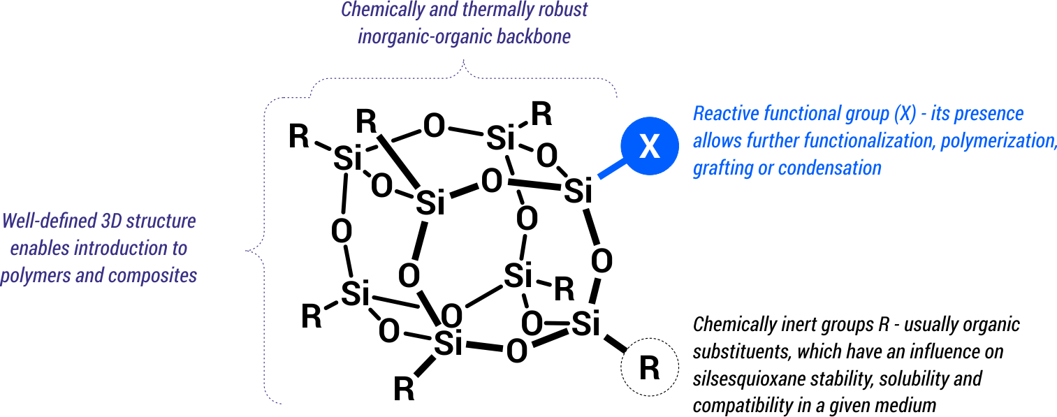 The presence of Si-O-Si groups in the silsesquioxane skeleton ensures high thermal and chemical stability of the entire system, while organic substituents affect such parameters as solubility, density, physical state and compatibility in polymer and composite systems. In turn, the presence of reactive substituents allows for the modification of silsesquioxanes by the formation of chemical bonds with new organic and organometallic functions, or by grafting with polymeric materials. The whole silsesquioxane cage forms a precisely defined, three-dimensional structure with nanometric dimensions.